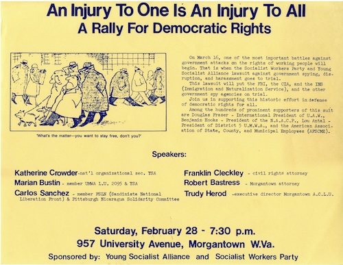 Another rally was held Feb. 28, 1981. Speakers included Bustin, YSA secretary Katherine Crowder, civil rights attorney Franklin Cleckley, Morgantown attorney Robert Bastress, Sandinista National Liberation Front member Carlos Sanchez, and Morgantown ACLU director Trudy Herod.
