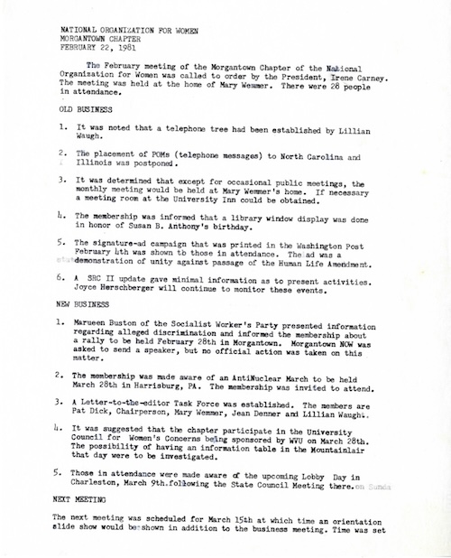 The pamphlet mentioned earlier in this article likely entered the NOW records after Bustin attended a Morgantown NOW meeting to promote this 1981 rally. Misidentified as “Maureen Buston,” she spoke at this meeting, but NOW members did not take action on sending a speaker to the rally.