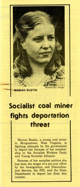 While living in Morgantown, West Virginia, and working in Republic Steel Kitt No. 1 Mine, Bustin came to the attention of authorities in late 1980 when the United States Immigration and Naturalization Service (INS) and Federal Bureau of Investigation (FBI) attempted to deport her for her membership in the Socialist Workers Party (SWP) and Young Socialist Alliance (YSA).
