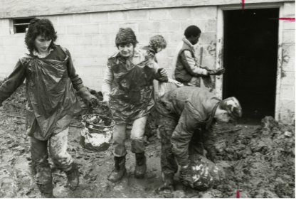From the Office of Institutional Advancement, relief volunteers from WVU aid in clearing mud.