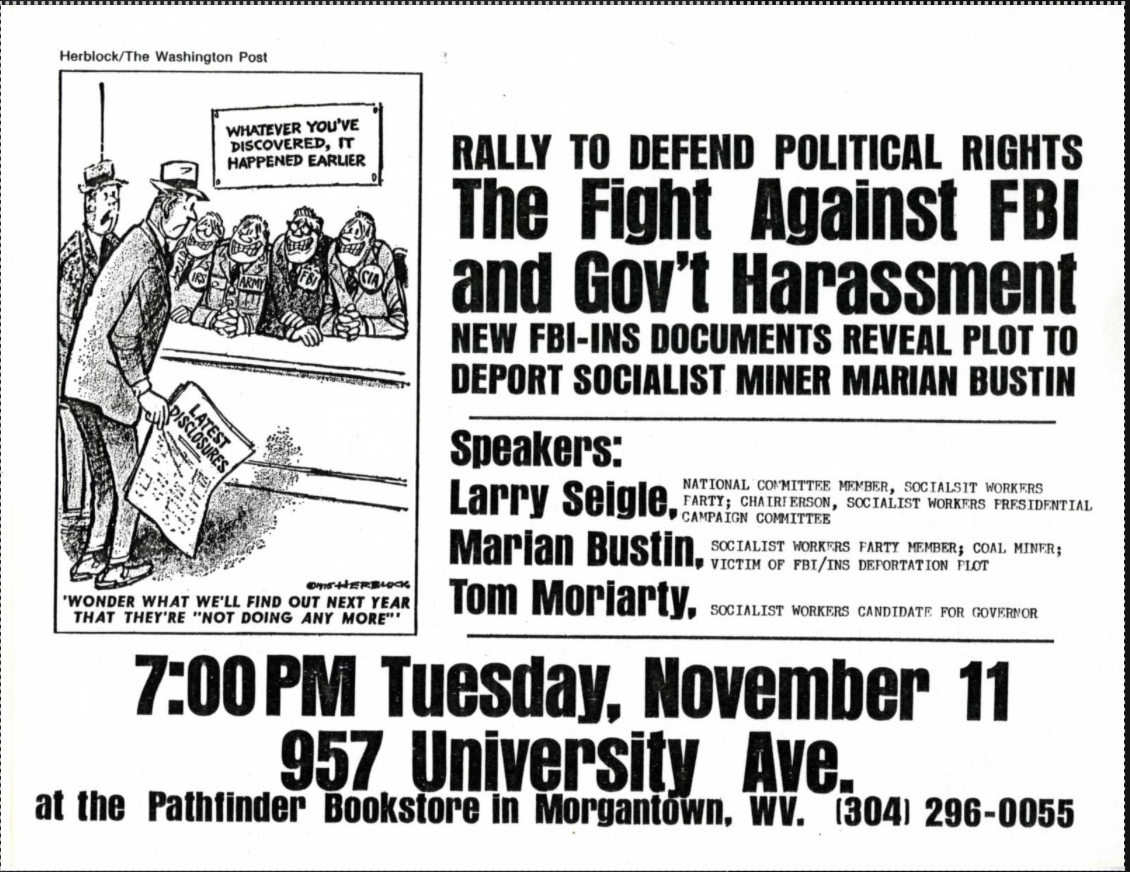 Bustin’s case was quickly taken on by the Morgantown SWP and YSA. On Oct. 31, 1980, Bustin made her first appearance in a press conference alongside Tom Moriarty, the 1980 Socialist Workers candidate for West Virginia governor, criticizing the government campaign against her, which aired on WCHS, WCAW radio, and WCHS-TV.4