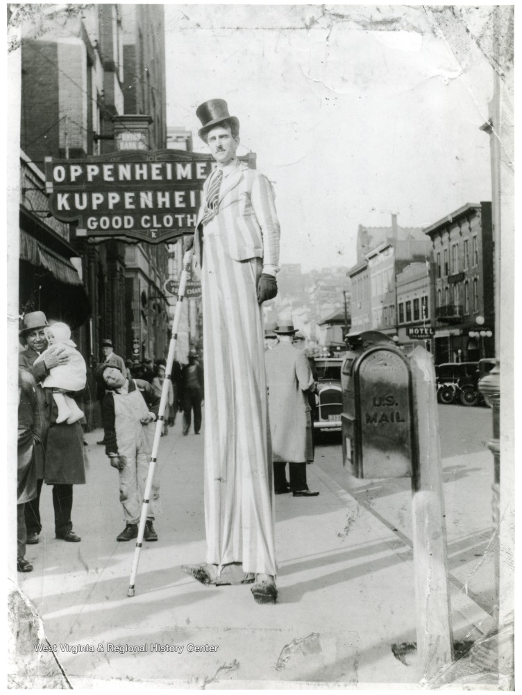 Lemley chose to show the photo below, where he was dressed as Charlie Chaplin on stilts. This photo is dated 1933, standing outside Oppenheimer’s Kuppenheimer Good Clothes store, a popular brand in the 1920s. Long wrote, “My construction of my stilt and the foot pivot is my own invention and makes it possible for me to move with comparative ease being a mechanical tall-man the hours I perform on them.” Long was on these stilts for 3-4 hours. In 1948, Russell L. Long portrayed Charlie Chaplin in the Morgantown Labor Day parade.